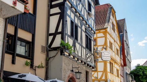 | Nicht immer fallen Häuser der Abrissbirne zum Opfer, sondern wurden liebevoll restauriert und stellen nun ein architektonisches Schmuckstück dar – so wie das Haus Schlinkengasse 7 an der Ecke „Am Bürgerhaus“ in der Bensheimer Altstadt. Bereits 1575 erbaut, gehört es zu den bedeutendsten Fachwerkhäusern der Stadt. Auf dem alten Foto, das Anfang der 1960er-Jahre aufgenommen wurde, war das Gebäude in einem erbärmlichen Zustand. Auch die Häuser Am Bürgerhaus 3 und 5 waren noch nicht saniert, und das Fachwerk war damals noch unter dem Putz verborgen. Abgerissen wurden das vordere Gebäude sowie das Eckhaus an der Bahnhofstraße. (Text: Thomas Neu, 10.6.2025; altes Bild: Stadtarchiv Bensheim; neues Bild: Thomas Neu) | |